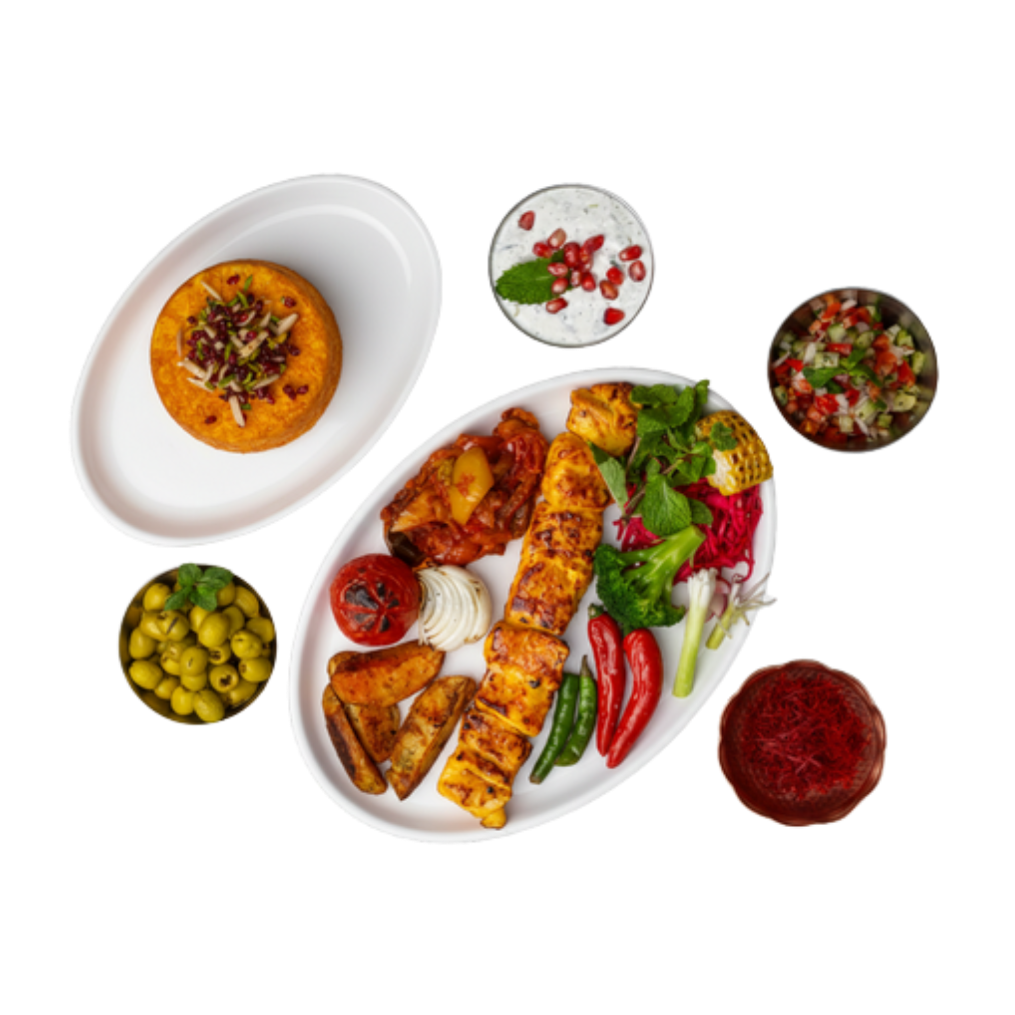 Saffron-infused grilled chicken served with rice or sautéed vegetables.